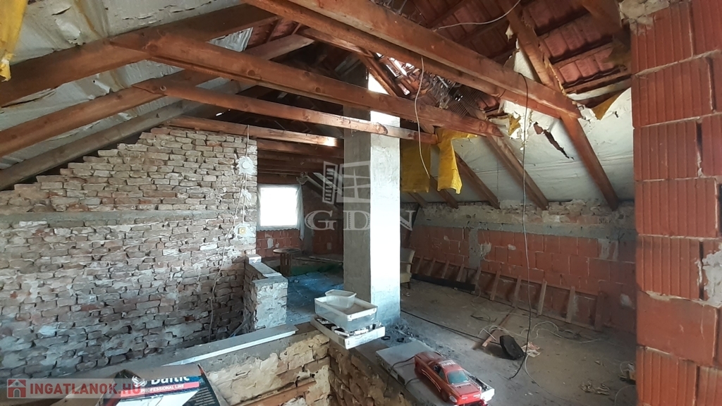 A főépület tetőterének hasznos alapterülete: 84nm + 13nm erkély. A tetőtér minden pontján legalább 180 cm a belmagasság, tehát teljes értékű, így rengeteg lehetőség nyílik számunkra. Képek között látható valós kép és jelenkori alaprajz, melyből látható milyen jó lehetőség. Kiépítése már félig megvalósult, a befejezése az új tulajdonosra vár.