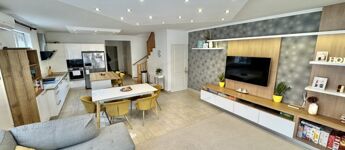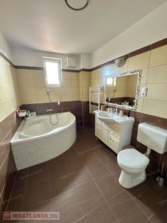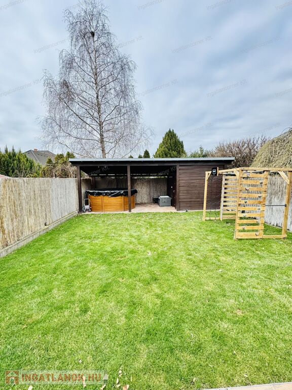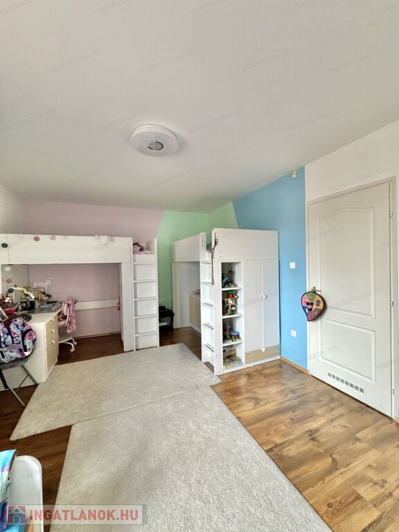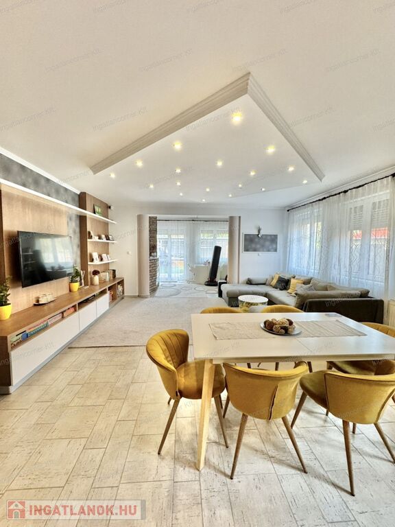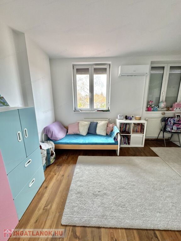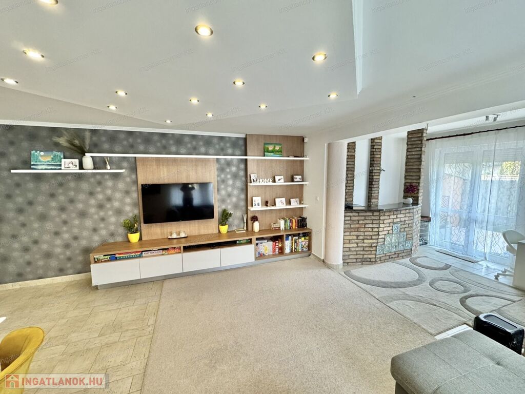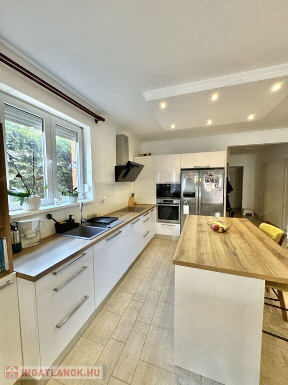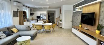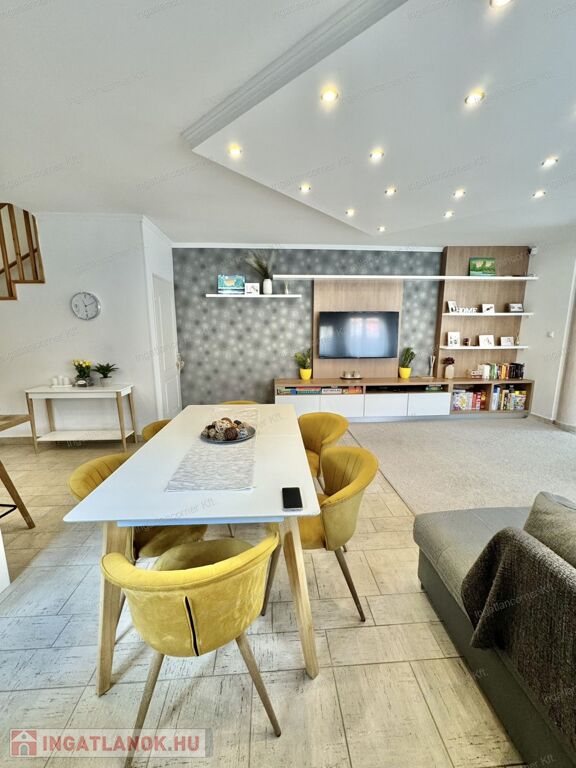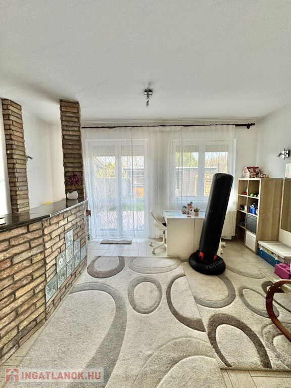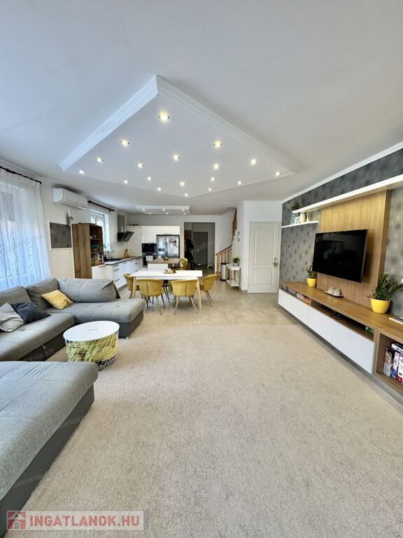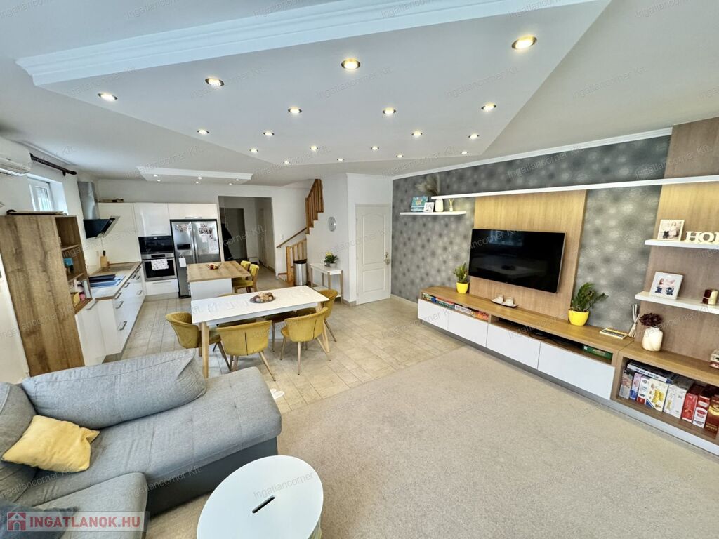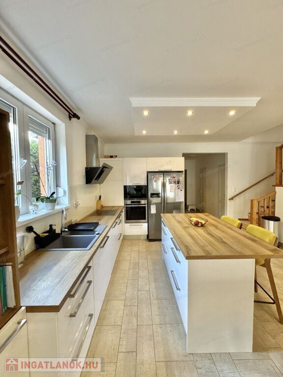 Dunaharaszti legkedveltebb részén, a Bezerédi lakóparkban, csendes, zöld környezetben, eladó 160 nm-es, nappali + 4 HÁLÓS gyönyörű kétszintes ikerház 380 nm-es telekkel, ALACSONY REZSIVEL!! Frissen festve, és felújítva. Az ingatlan HATALMAS ablakai a hátsó kertre néznek. Az ablakokon szúnyogháló és redőny található. 2008-ban, 30 cm-es Porotherm téglából épült, 12 cm küldő szigetelés került fel. A sok méretes ablaknak köszönhetően NAGYON VILÁGOS a nappali. A konyha felszereltsége: beépített -sütő, -főzőlap, -mikró és -mosogatógép, páraelszívó. Az alsó szinten található az előszoba, zuhanyzó wc-vel, vendégszoba, mosókonyha, garázs elektromos autótöltővel, kamra, am-konyha-nappali + plusz egy 14 nm-es dolgozó/tanuló rész lett kialakítva. Ezáltal a nappali mérete 61 nm! A nappaliból egy üvegajtón keresztül léphetünk ki a 16 nm-es teraszra, amely a hátsó kertre nyílik. A felső szinten 3 hálószoba (egyik saját gardróbbal), egy jó méretű kàdas fürdőszoba WC-vel kapott helyet. A padlástér ki lett alakítva, pakolható. A kertben automata öntözőrendszer van kiépítve a fúrt kútról, továbbá egy fém külső tároló található még az udvaron. Kombi cirkó biztosítja a fűtést (radiátor) és a melegvíz ellátást. 4 db klíma. Közvetlenül a lakópark területén található pizzéria, szépségszalon, kisbolt, 2 db óvoda és bölcsőde. Valamint tervben van egy új általános iskola építése is. Pár hónapja került átadásra a város új sportpályája, ahol kosárlabdapálya, focipálya, futópálya, kondipark és ping-pong asztalok várják a sportolni vágyókat. Továbbá pár perc sétára található egy két játszótér is a kisgyermekek részére. A főváros megközelítéséhez több közlekedési eszközt és útvonalat is igénybe vehetünk. Budapestre autóval, HÉV-vel és távolsági busszal is el lehet jutni, illetve a vasút felújítása folyamatban van. Autóval 5 perces távolságra LIDL, ALDI, TESCO és rengeteg egyéb üzlet is található! Jöjjön el, tekintse meg az ingatlant!