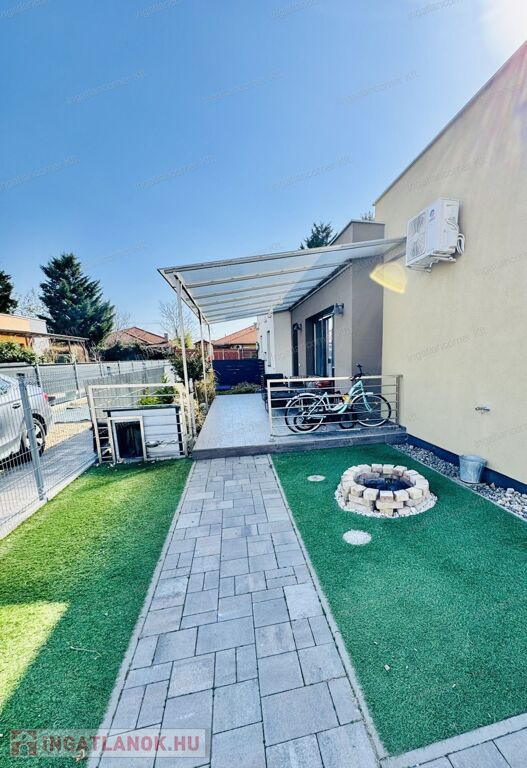 2019-ben épült, modern és különleges hangulatú ikerház eladó Dunaharaszti egyik legkedveltebb, csendes, zöldövezeti részén, a Bezerédi lakópark zsákutcájában.