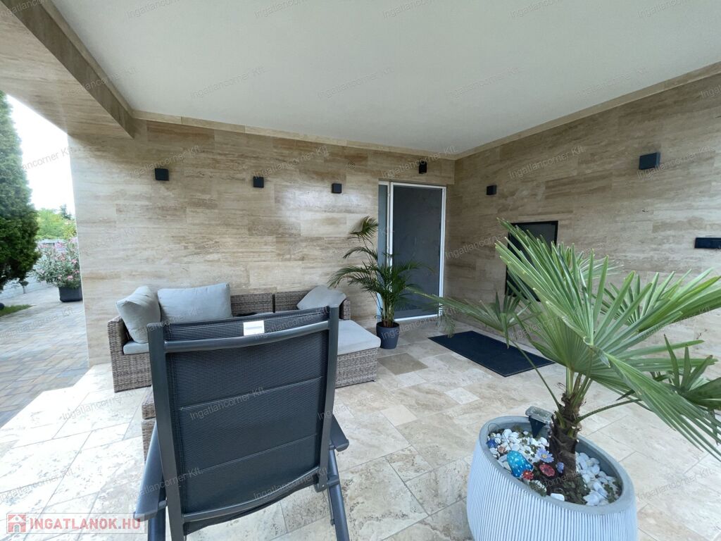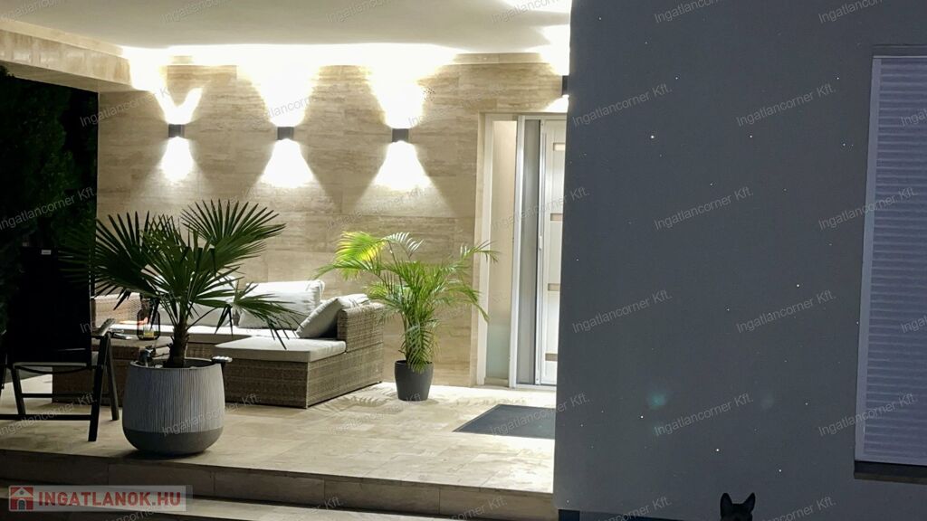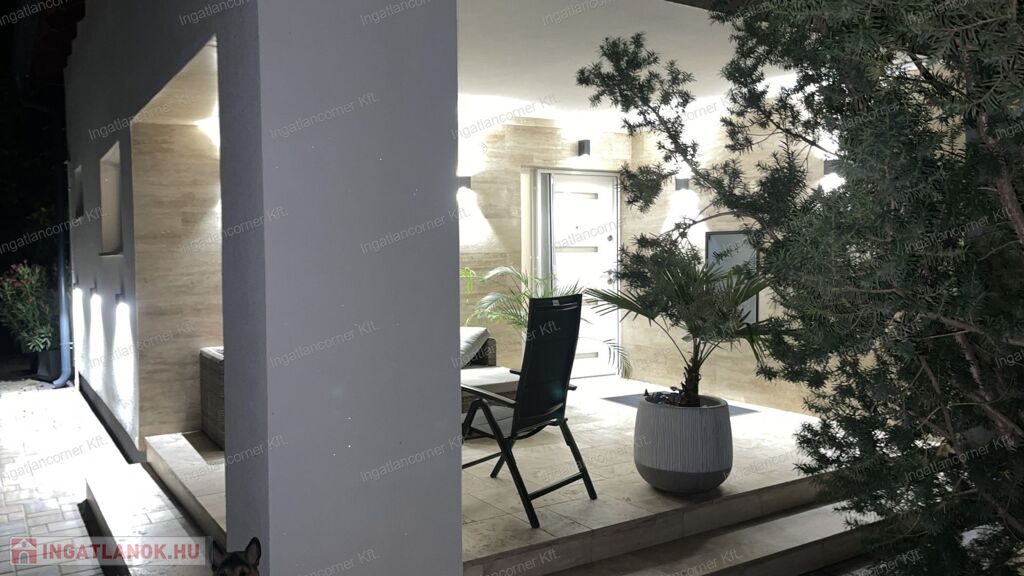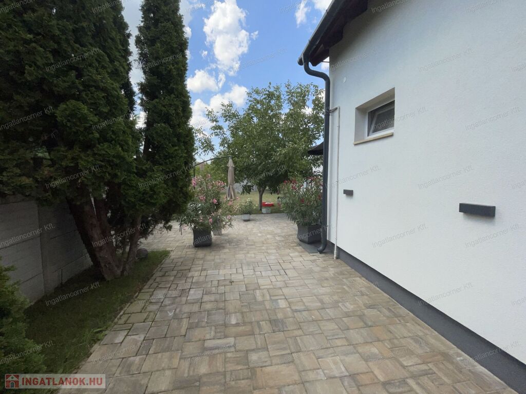 A ház egy 720 m²-es, összközműves telken fekszik, gondosan kialakított, ápolt kerttel, kocsibeállóval, elektromos kapuval, díszburkolattal és igényes kültéri világítással. A telek mérete lehetővé teszi akár további építmények elhelyezését is.