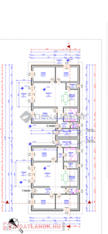 Kialakítása: 3 szoba, nappali, konyha+étkező, előtér, közlekedő, fürdő, külön wc, kamra, tároló, 15 m2 nyitott terasz.
