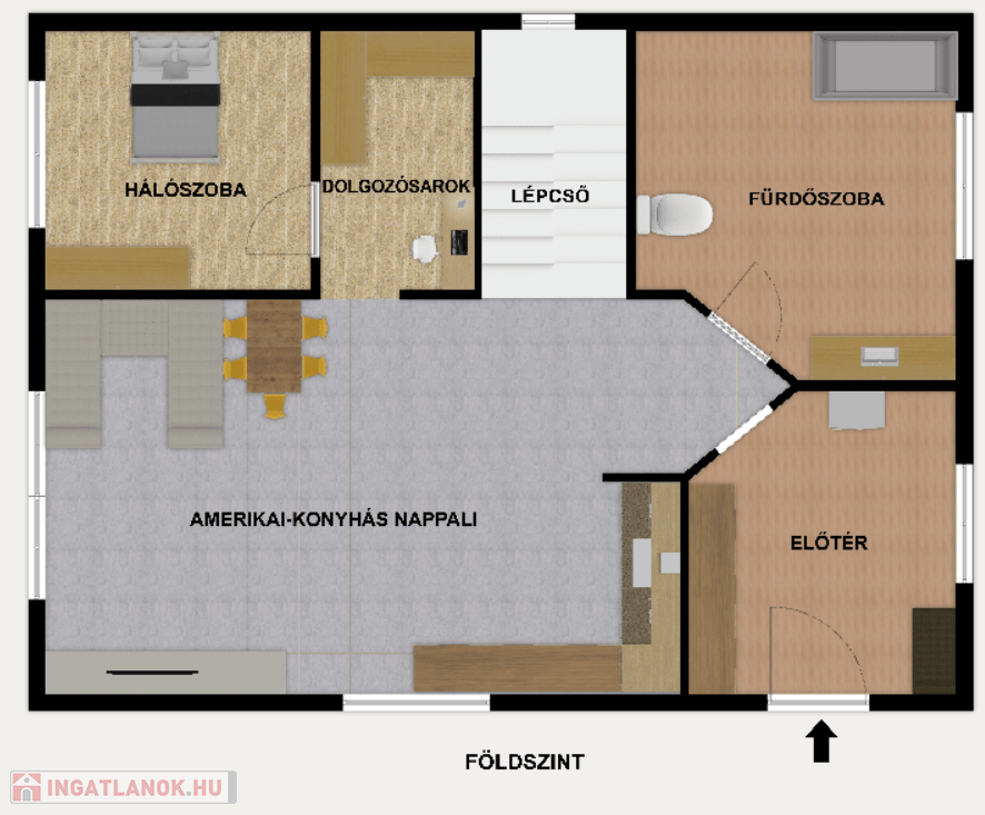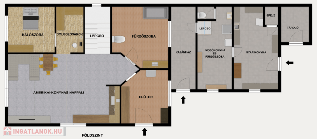A földszinten amerikai konyhás nappali, hálószoba, dolgozósarok és kádas fürdőszoba található. Az emeleten két hálószoba, gardrób, nappali, zuhanyzós fürdőszoba, valamint egy tárolóhelyiség kapott helyet.