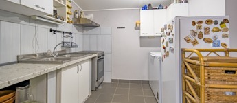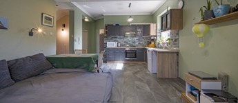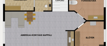 Az épülethez tartozik egy 60 m²-es lakrész is, amelyben amerikai konyhás nappali, zuhanyzó és WC található.