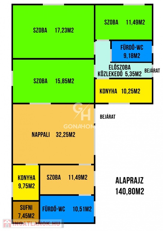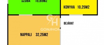 * 2. lakrész (kb. 72 m²): nappali, szoba, fürdőszoba, konyhafülke