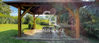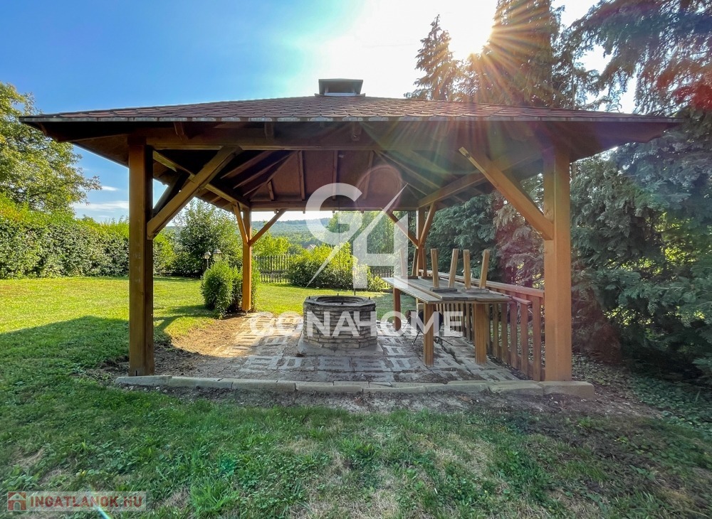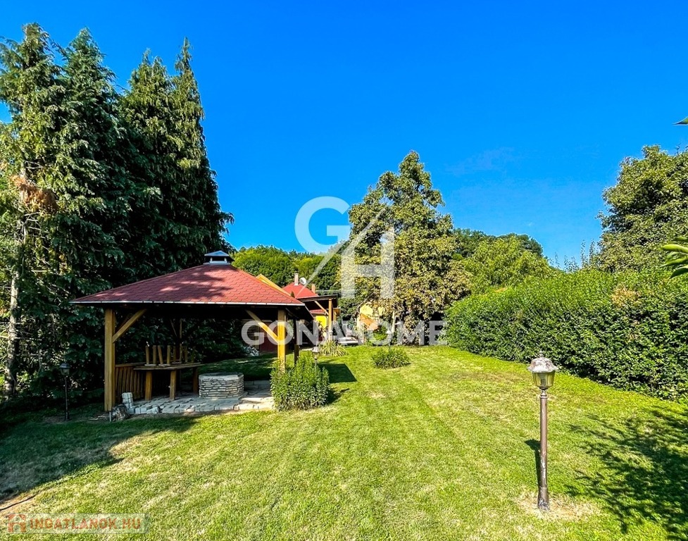 A 2388 m²-es telken gondozott kert, termő gyümölcsfák, gesztenyefák és a telek végében csörgedező kis patak kínál nyugalmat, mindezt a Bakony lenyűgöző panorámája teszi teljessé.