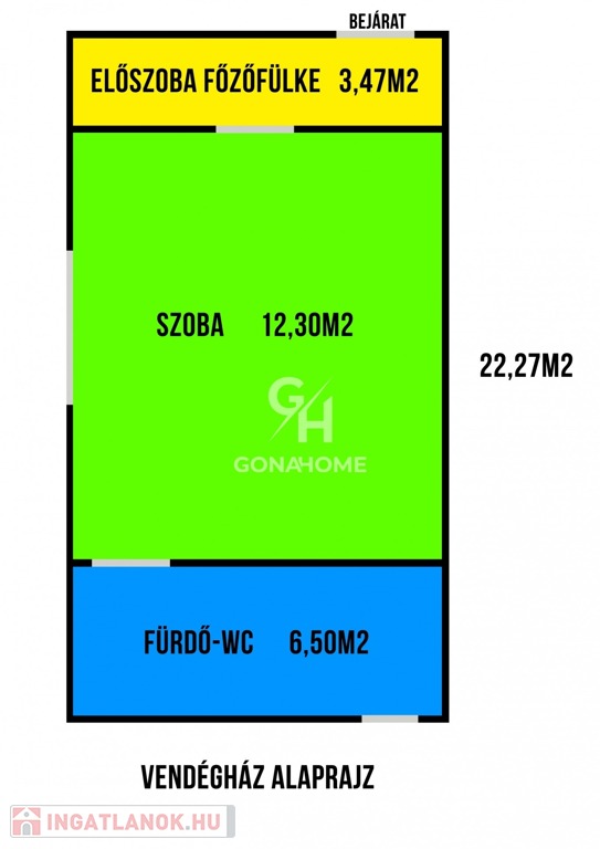* Kis apartmanház (kb. 22 m²): előtér, főzőfülke, szoba, fürdőszoba