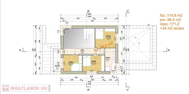 A ház nettó alapterülete 135 nm + 36 nm garázs, 34nm terasz.