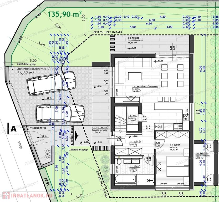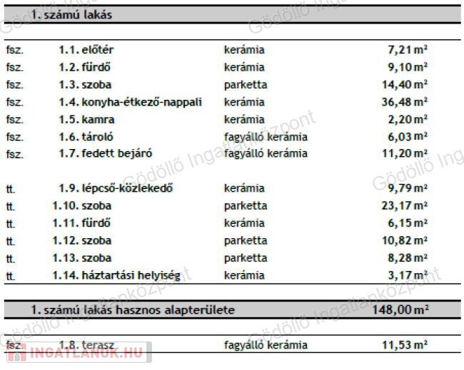 - Földszint: előtér, nappali-konyha-étkező, kamra, szoba, fürdő + 11,53nm terasz és 6,03nm tároló.