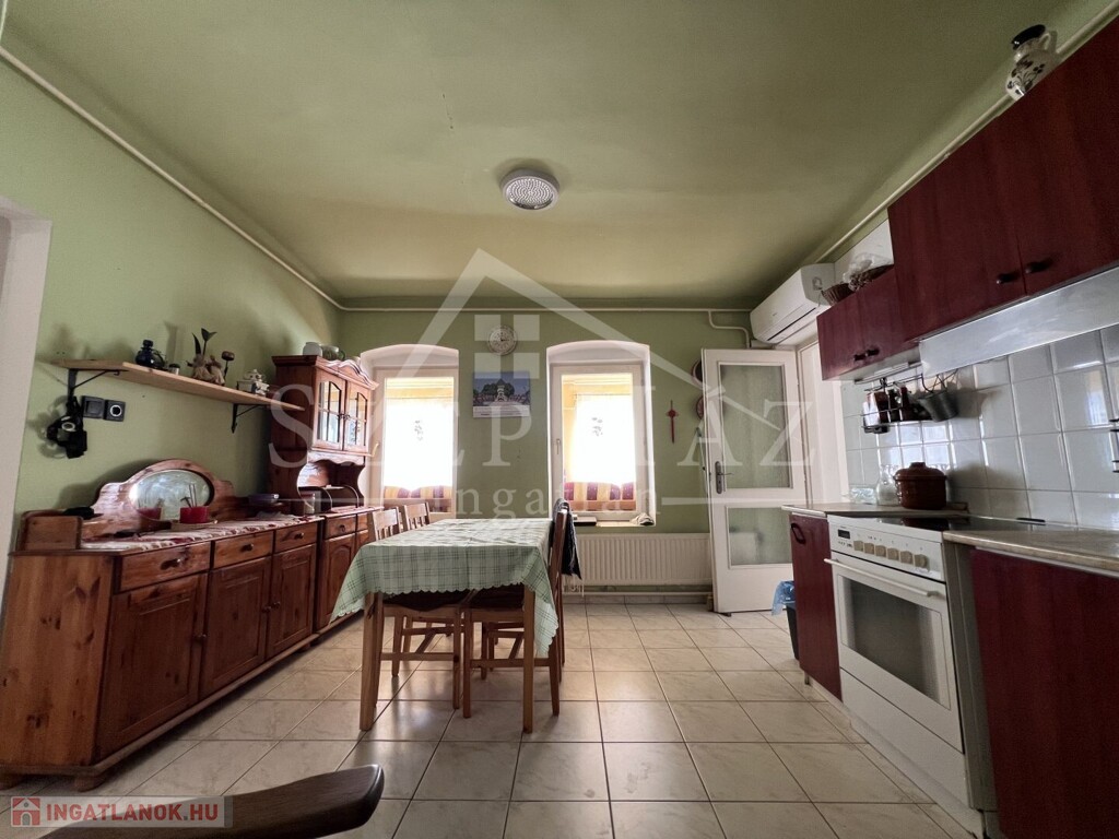 A hátsó részben egy nagy étkező-konyha, spájz, szoba, fürdőszobával.