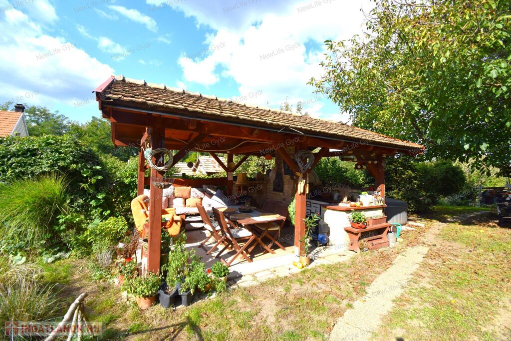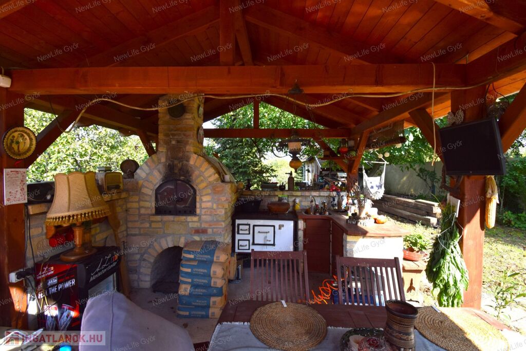 A ház mögött megtalálható egy kis dísztó aranyhalakkal. Ezt követően szintén balkéz felől egy oldalról nyitott nyári konyha következik kemencével, mosogatóval, sparhelttel. A fa szerkezetű filagória (kb 20 m2) betoncserépfedést kapott, nagyszerű hely ez baráti összejövetelekre, kinti főzőcskére.