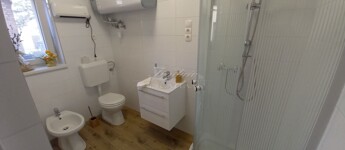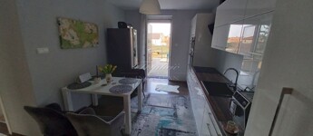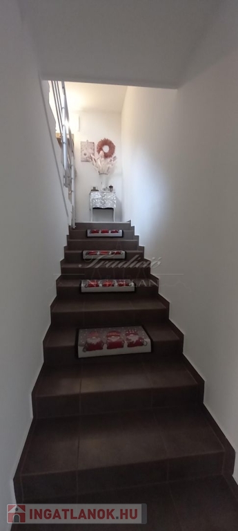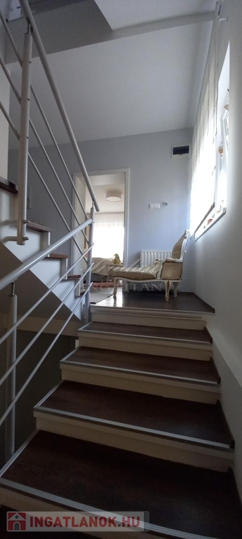 Az emeleti szint a hátsó terasz irányából is megközelíthető, itt egy étkezős konyha (még nem használt, vadonatúj konyha, felső kategóriás gépekkel) , egy fürdőszoba, valamint 2 szoba található, amelyből az egyik szoba nappaliként a másik pedig egy saját erkéllyel rendelkező hálószobaként funkcionál. A tetőtérben további két kellemes méretű hálószoba, a háztartási helyiség és a harmadik fürdőszoba található.