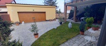 A szépen karbantartott, parkosított, térkövezet telken a családi ház mellet egy dupla garázs és egy tároló is helyet kapott. A nagyméretű bejárati kapu és a szankcionált garázskapu is motorral van szerleve. A garázs mögött parkosított, fűvel beültettet rész található.