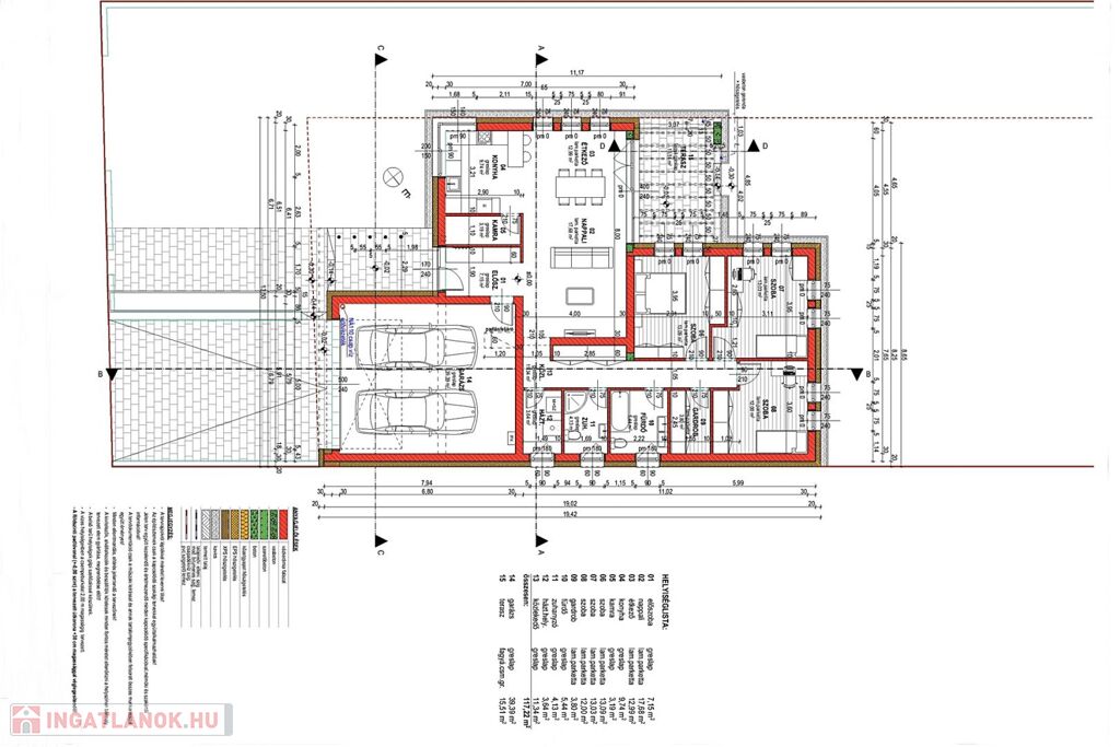 Ház helyiségei: Nappali 17,68 m2, Konyha 9,74 m2, étkező 12,99 m2, 3 háló (12 m2, 13,03 m2, 13,09 m2 ), 5,44 m2 fürdő, 3,8 m2 gardrób, 3,19 m2 kamra, 3,64 m2 háztartási helyiség, 4,13m2 WC+zuhanyzó, 11,34 m2 közlekedő, 7,15 m2 előszoba. + 15.15 m2 TERASZ