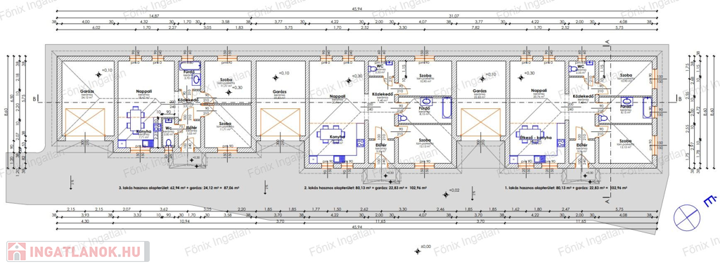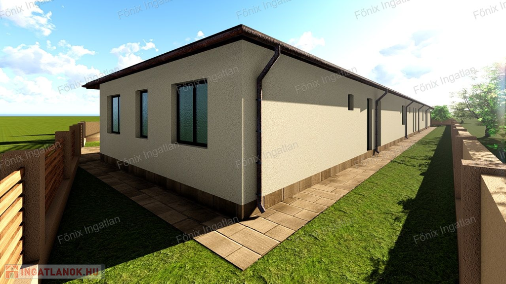 87,06 m² hasznos alapterület, ebből 62,94 m² lakótér – nappali amerikai konyhával, 2 hálószoba, 2 WC/fürdő, garázs és nagy méretű saját kert.