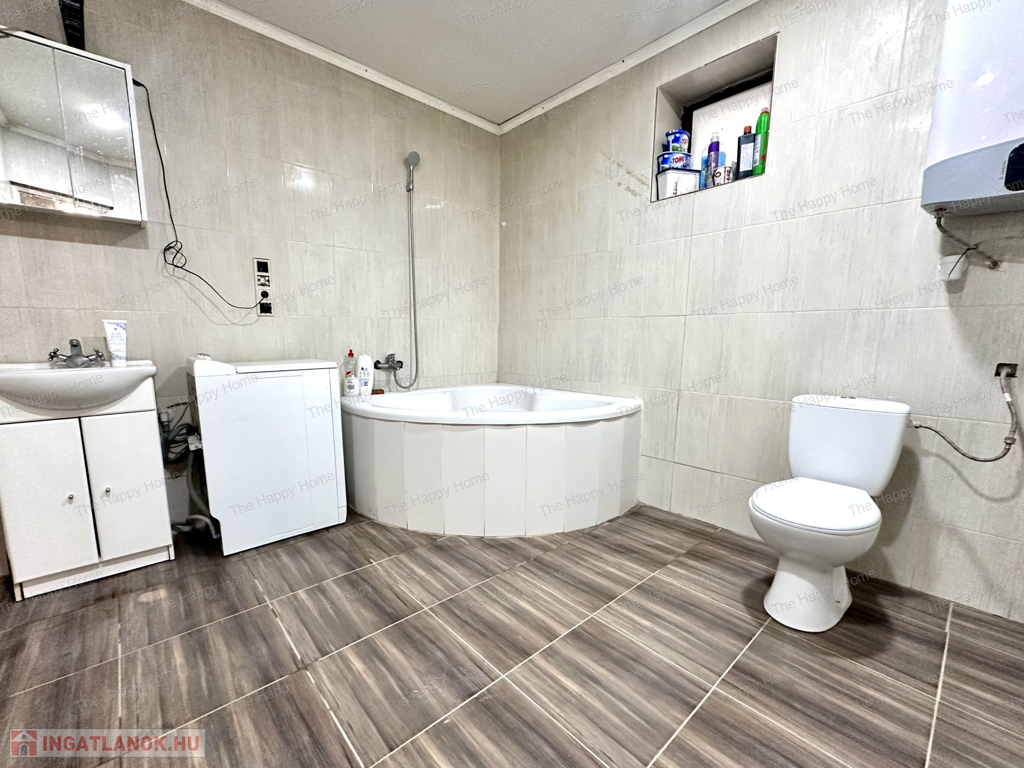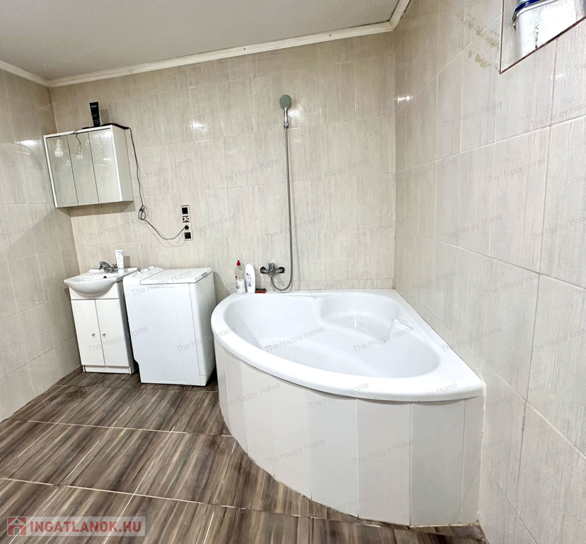 A felújított, sarokkáddal felszerelt fürdőszobában a melegvizet egy új Ariston VILLANYBOJLER szolgáltatja.