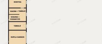 Nappali, három szoba, konyha, fürdő+wc, háztartási helyiség és szauna