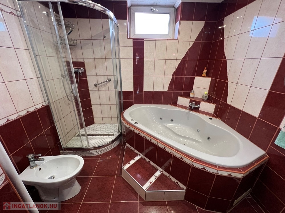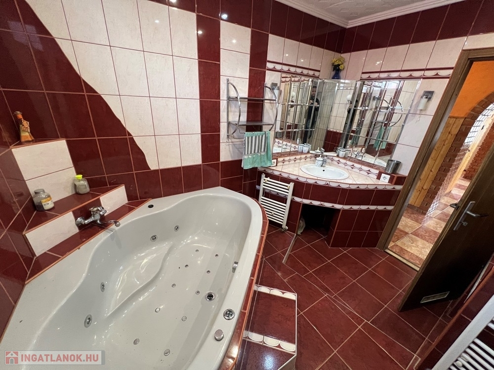Jobaháza rendkívül kedvelt részén, 3513 m2-es, 20,5 m széles UTCAFRONTÚ telken lévő, jelentős felújításokon átesett (nyílászárócsere, tetőhéjazat csere, homlokzati hőszigetelés, alsó szinten villanyvezetékcsere, vízvezetékcsere, fürdő – WC felújítás, burkolatcsere, stb.) konyha + étkező + 5 hálószobás, továbbá kamrával is felszerelt, duplakomfortos (2 db fürdőszoba + WC), KLIMATIZÁLT, jó állapotú, 155 m2 hasznos alapterületű családi ház, 6,33 m2-es erkéllyel, 99 m2 alápincézett résszel, 86,6 m2-es garázzsal, 19,06 m2-es garázzsal, 92 m2-es műhellyel, továbbá 7 m x 3,5 m-es fedett épített medencével és saját kerti halastóval eladó!