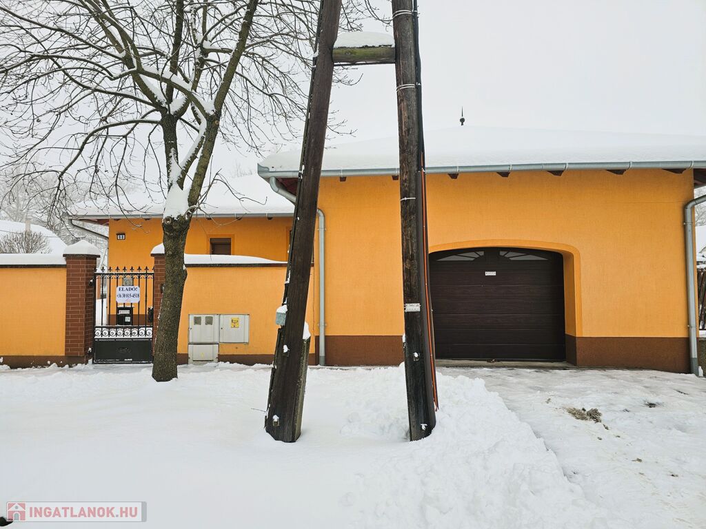 A ház elosztása praktikus: nappali–konyha–étkező, 2 szoba, spájz, fürdőszoba, külön WC, kazánház; az egyik szoba klímás. Az autó számára 32 m²-es, fűtött garázs áll rendelkezésre elektromos kapuval, közvetlen házi bejárattal. Riasztó és fedett kerti tároló is növeli az ingatlan értékét. A rendezett udvart füves kert, tuják és kertitó díszíti, az ingatlant masszív, színezett téglakerítés határolja kovácsoltvas kapukkal.