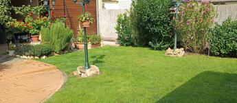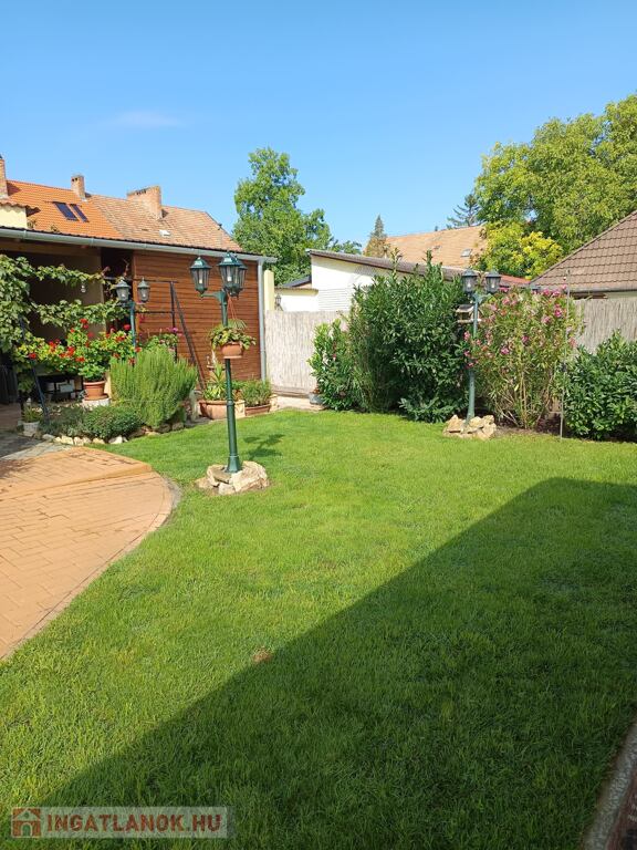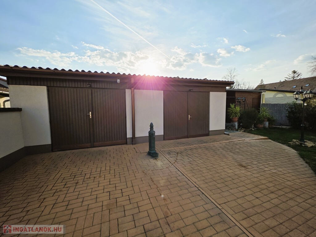 A rendezett udvar térkövezett és füves részekkel, mediterrán növényekkel kialakított. A 18 m²-es grillterasz és a dupla, összesen 56 m²-es garázs tovább növeli az ingatlan értékét.