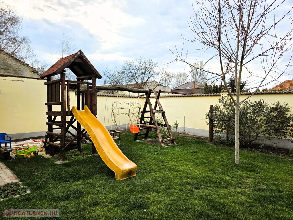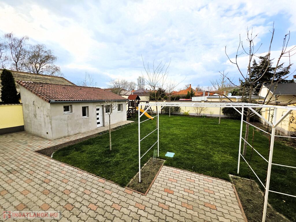 A rendezett, térkövezett és füvesített udvar automata öntözőrendszerrel, elektromos kapuval, videós kaputelefonnal, riasztó- és kamerarendszerrel felszerelt. A kertben szőlőlugas, gyümölcsbokrok, cseresznyefa és árnyékot adó juharfák teremtenek kellemes hangulatot.