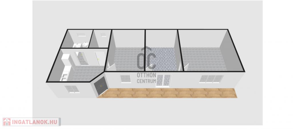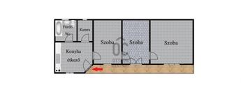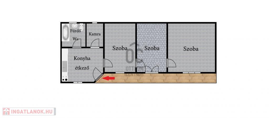 Az utcáról az udvaron át megközelíthető házba, a kis fedett teraszról léphetünk, a konyha-étkezőbe, melyből a mosdó, a spejz, és egymást követően a szobák érhetők el.