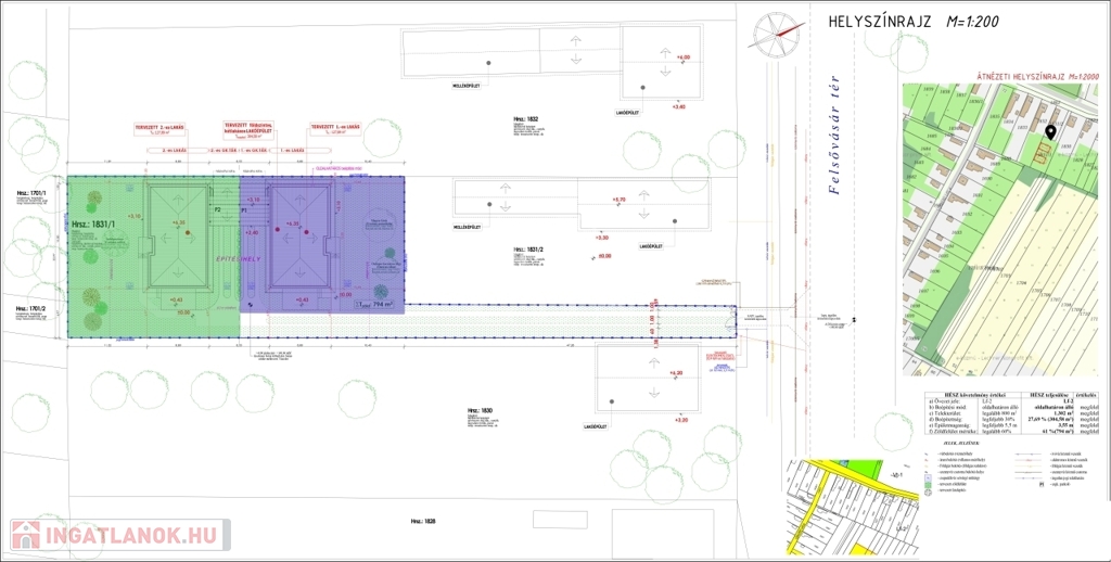 Az első házhoz 470 m²-es, míg a hátsó házhoz egy 560 m²-es, kizárólagos használatú, lekerített telekrész tartozik.