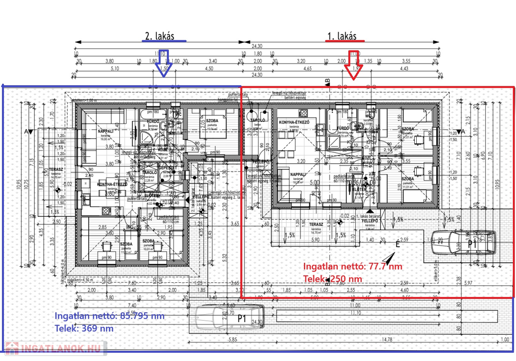 Az ingatlanban előszoba, 3 szoba, nappali+ konyha, fürdőszoba, vendég Wc., közlekedő, tároló, gépészet és egy terasz kerül kialakításra.