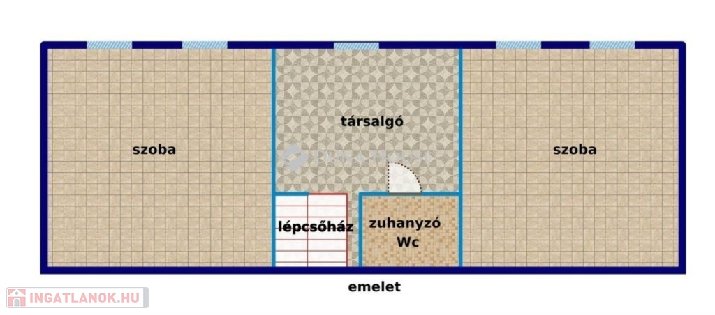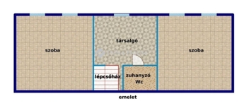 Az emeleten két nagyméretű szoba, társalgó és fürdőszoba található.