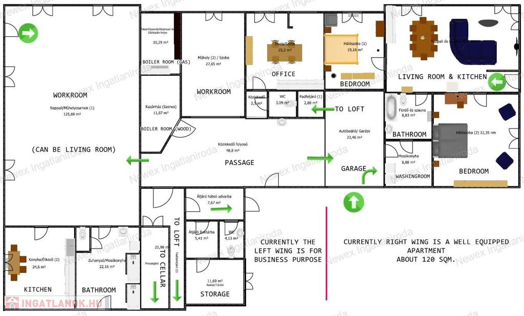 2.) A Nyugati szárnya egyedi kézműves gyártóműhelyként üzemel, irodával és kiszolgáló helyiségekkel, amely akár átalakítható privát használatra is, de a szálláshely bővítésére is alkalmas
