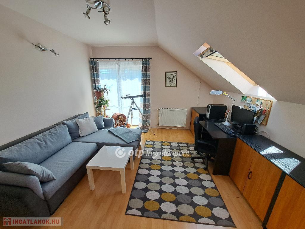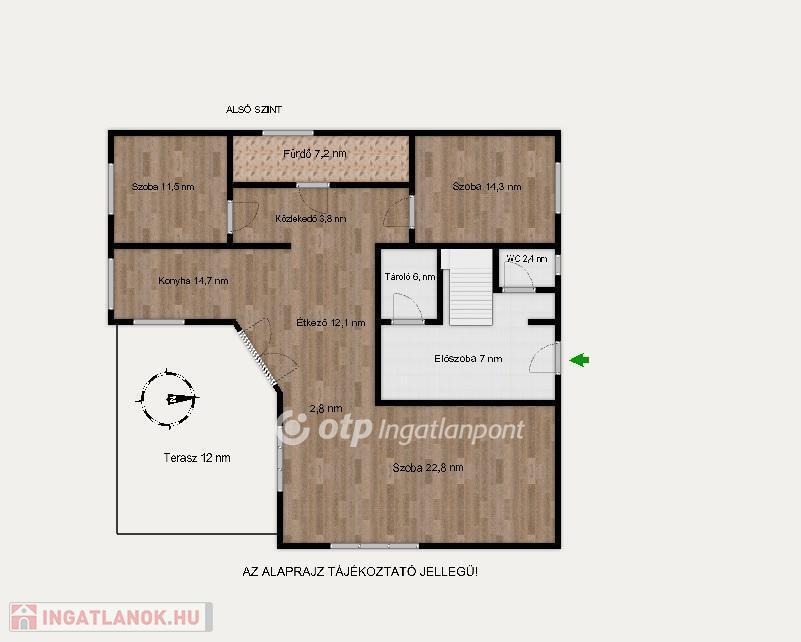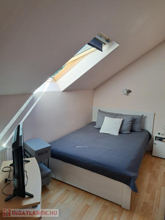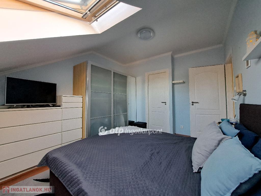 Az alsó szinten: tágas nappali, két hálószoba, étkezős konyha, fürdőszoba, gardrób és külön WC.