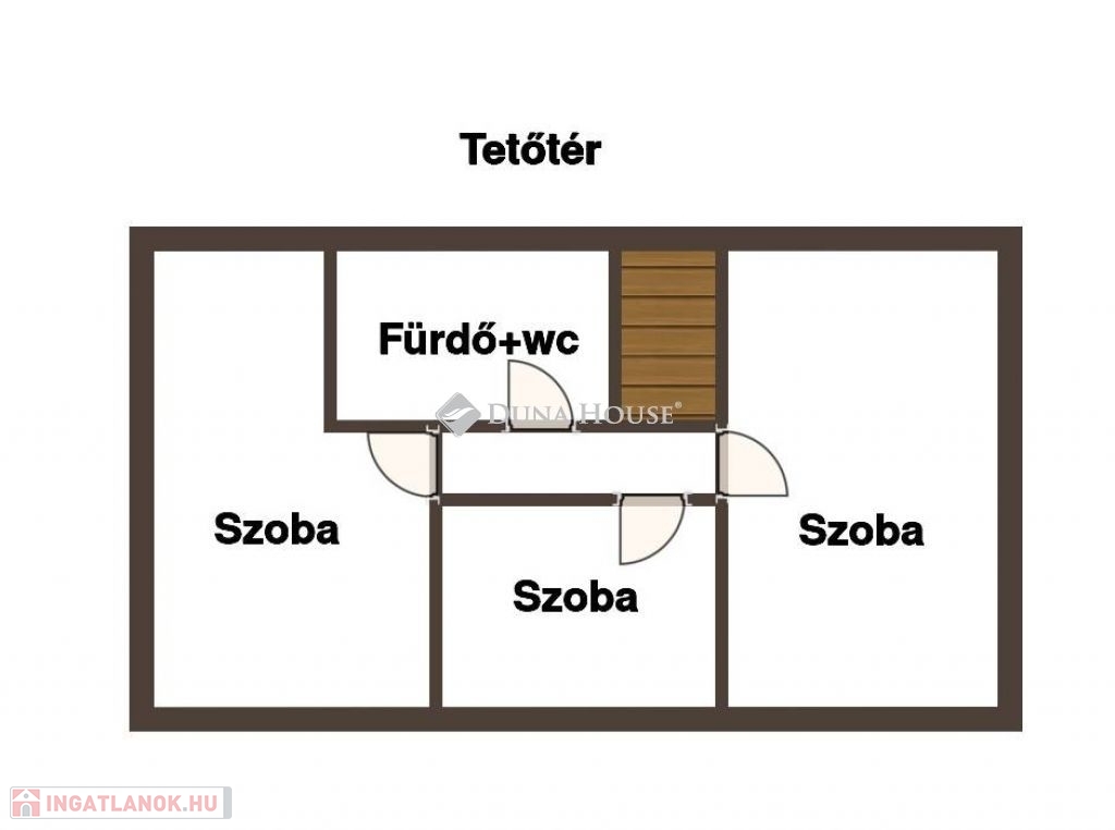 Földszinten egy 15 nm-es szoba, a tetőtérben három nagyobb.