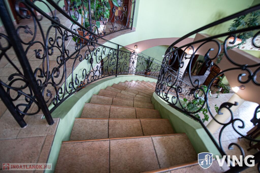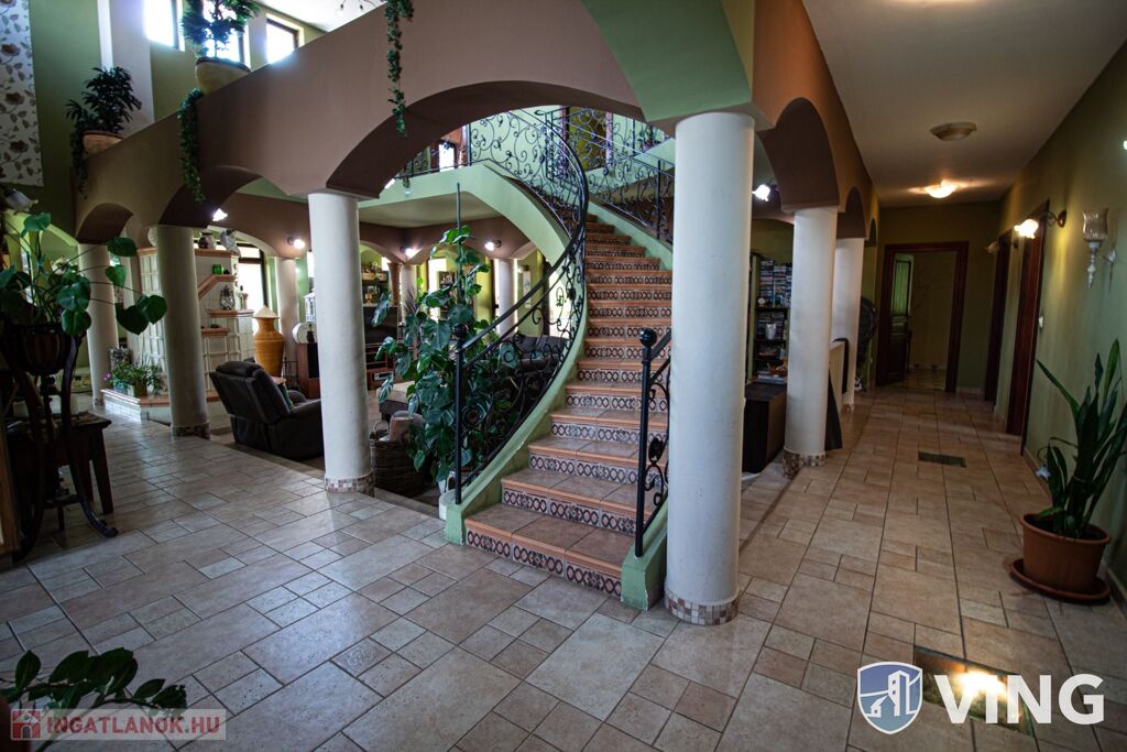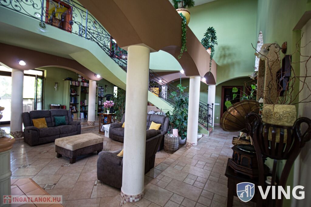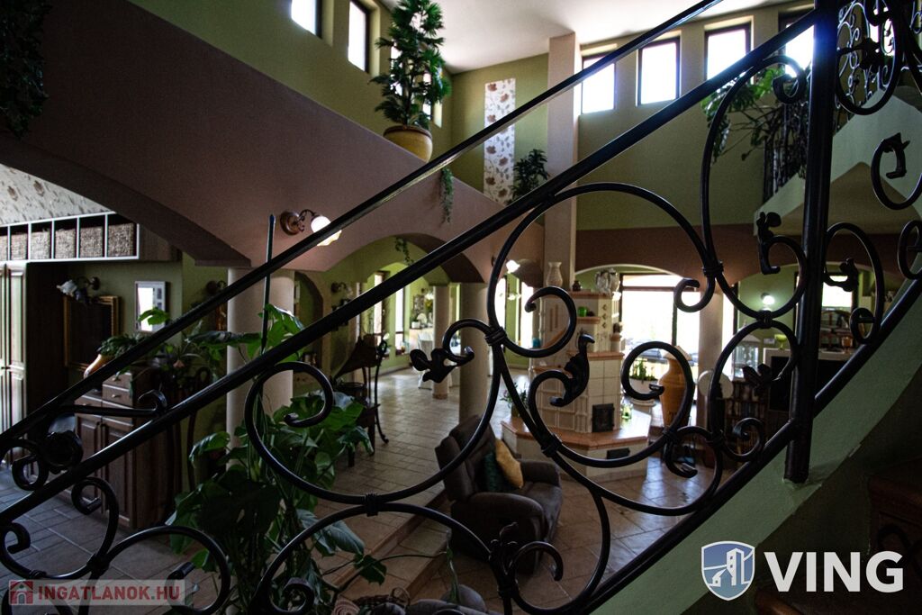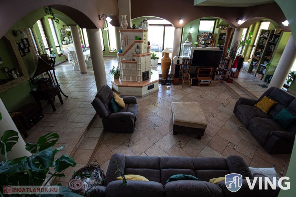 A tulajdonosok a megépítés során minden részletre odafigyeltek és a teljes építkezést felügyelték. A ház 38-as Phorotherm téglából épült, mely nemes vakolattal lett ellátva, a tető pedig Terrán héjazatot kapott. Az ingatlan belső kialakítását nézve a nagy terek dominálnak, hisz minden helyiség a nappaliból belátható. Az ingatlanba belépve egy szép, tágas előszobába érkezünk, mely térből már láthatóvá válik a belső szinteltolás is, ami szintén a mediterrán stílus jelképe. Ezen helyiségből továbbhaladva, tudjuk egy egyedi ívelt lépcsőn megközelíteni a felső szintet, amely 3 külön bejáratú szobából egy külön fürdőből és egy külön mellékhelyiségből áll. Mind 3 szobához teraszkapcsolat tartozik. Az alsó szintre visszatérve, található 2 külön bejáratú szoba, egy nagy légtérrel rendelkező nappali konyha étkező szintén teraszkapcsolatokkal. A ház tájolásának köszönhetően amely kelet-nyugat-dél a nap minden szakában a beltér fényáradatban úszik. A szigetelésről műanyag nyílászárok fa színben gondoskodnak. Az árnyékolást, exotikus gőzölt fa reluxák oldják meg. A meleg nyári napok lehűtésében, több beltéri klíma segédkezik. A hideg téli napok kifűtésében és a meleg víz előállításban, egy nagy teljesítményű cirkó kazán, használati melegvizes tartállyal összekapcsolva, radiátorokon és padlófűtésen keresztül gondoskodik, ezzel szolgálva a bent lakók kényelmét. A nappali hangulatát tovább fokozza, a központilag elhelyezett fa tüzelésű cserépkályha is amelynek melege, a fa ropogása szintén hozzájárul a lakrész téli nyugalmához. A ház belső hangulatát, a teraszra kilépve is érezhetjük, a felfuttatott szőlőnek és a szép igényes kertnek köszönhetően. A terasz adottságai nagyobb családi rendvények, partik megrendezésének tökéletes helyszíne. Gépkocsikkal való parkolás a dupla garázsban megoldott ami kapcsolatban van a belső lakrésszel is. A lakók biztonságára riasztó rendszer vigyáz, mely a nem kívánatos mozgás illetve ajtónyitás esetén azonnal jelez a távfelügyeleti cégnek.