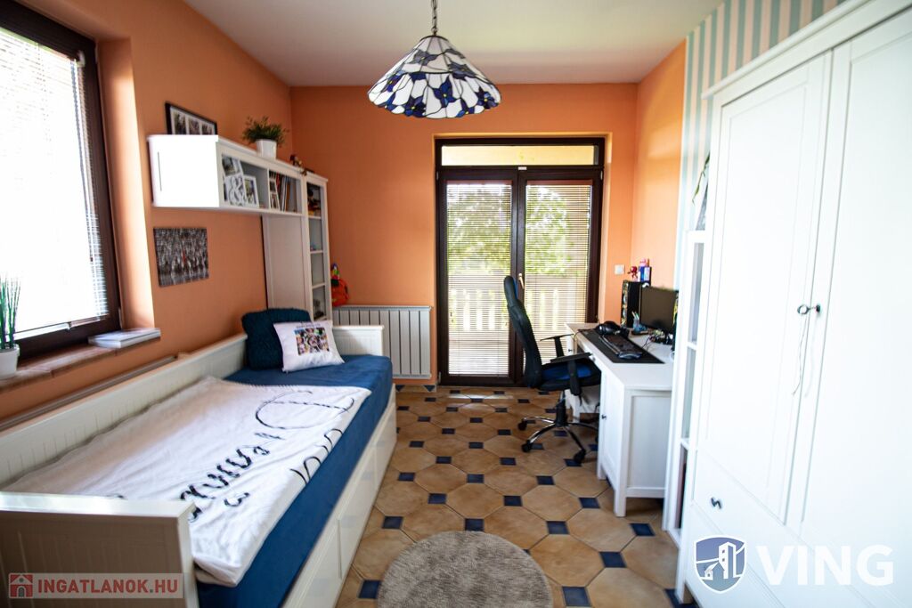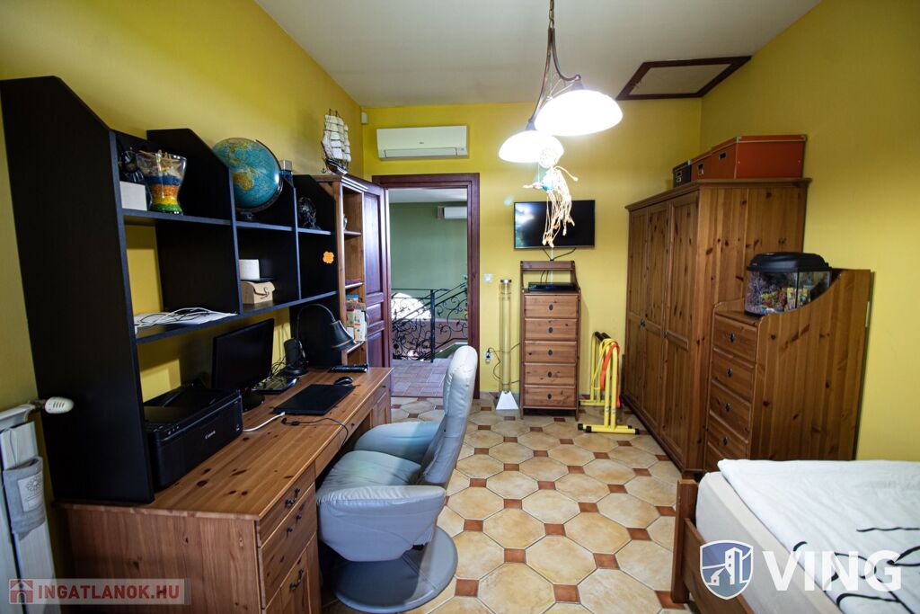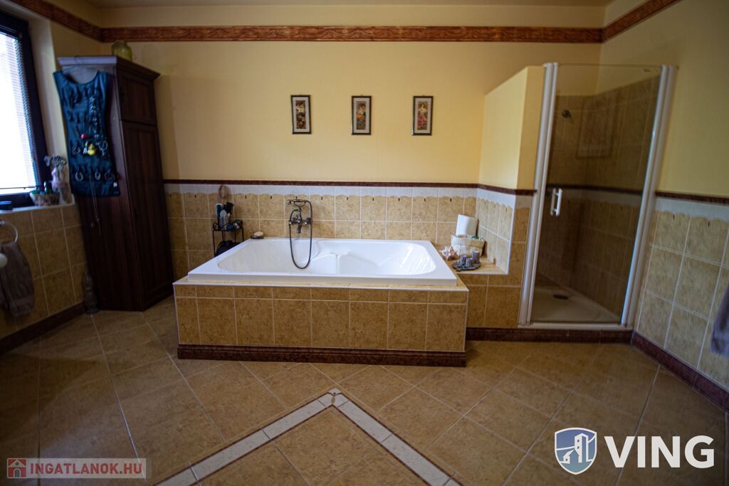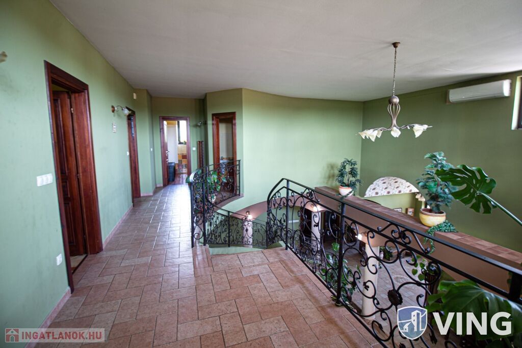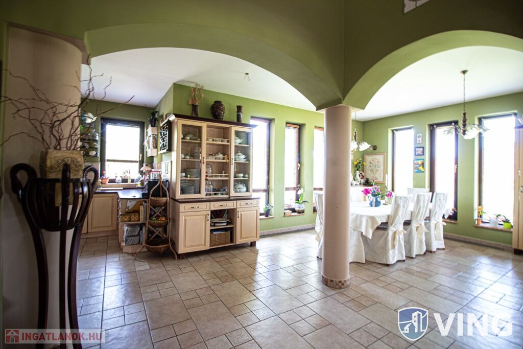 A tulajdonosok a megépítés során minden részletre odafigyeltek és a teljes építkezést felügyelték. A ház 38-as Phorotherm téglából épült, mely nemes vakolattal lett ellátva, a tető pedig Terrán héjazatot kapott. Az ingatlan belső kialakítását nézve a nagy terek dominálnak, hisz minden helyiség a nappaliból belátható. Az ingatlanba belépve egy szép, tágas előszobába érkezünk, mely térből már láthatóvá válik a belső szinteltolás is, ami szintén a mediterrán stílus jelképe. Ezen helyiségből továbbhaladva, tudjuk egy egyedi ívelt lépcsőn megközelíteni a felső szintet, amely 3 külön bejáratú szobából egy külön fürdőből és egy külön mellékhelyiségből áll. Mind 3 szobához teraszkapcsolat tartozik. Az alsó szintre visszatérve, található 2 külön bejáratú szoba, egy nagy légtérrel rendelkező nappali konyha étkező szintén teraszkapcsolatokkal. A ház tájolásának köszönhetően amely kelet-nyugat-dél a nap minden szakában a beltér fényáradatban úszik. A szigetelésről műanyag nyílászárok fa színben gondoskodnak. Az árnyékolást, exotikus gőzölt fa reluxák oldják meg. A meleg nyári napok lehűtésében, több beltéri klíma segédkezik. A hideg téli napok kifűtésében és a meleg víz előállításban, egy nagy teljesítményű cirkó kazán, használati melegvizes tartállyal összekapcsolva, radiátorokon és padlófűtésen keresztül gondoskodik, ezzel szolgálva a bent lakók kényelmét. A nappali hangulatát tovább fokozza, a központilag elhelyezett fa tüzelésű cserépkályha is amelynek melege, a fa ropogása szintén hozzájárul a lakrész téli nyugalmához. A ház belső hangulatát, a teraszra kilépve is érezhetjük, a felfuttatott szőlőnek és a szép igényes kertnek köszönhetően. A terasz adottságai nagyobb családi rendvények, partik megrendezésének tökéletes helyszíne. Gépkocsikkal való parkolás a dupla garázsban megoldott ami kapcsolatban van a belső lakrésszel is. A lakók biztonságára riasztó rendszer vigyáz, mely a nem kívánatos mozgás illetve ajtónyitás esetén azonnal jelez a távfelügyeleti cégnek.