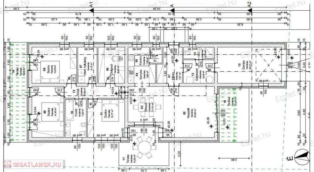 Az ingatlan 21 nm es garázzsal és három nagy méretű terasszal rendelkezik. A teraszok méretei: 14 nm, 19 nm és még egy 14 nm-es terasz. A ház fűtéséről hőszivattyú gondoskodik, ehhez társul egy napelem rendszer. Ennek köszönhetően a rezsi költségek minimalizálódnak. A ház egy 750 nm-es telken fekszik, további gépjármű beállási lehetőséggel.