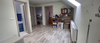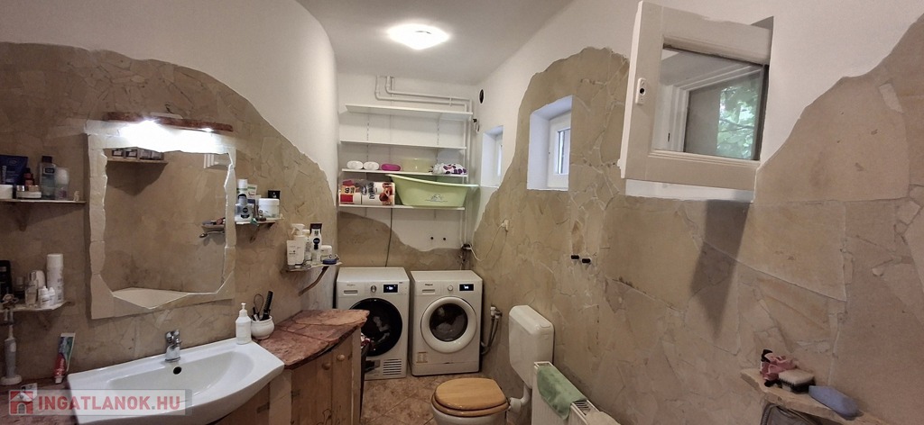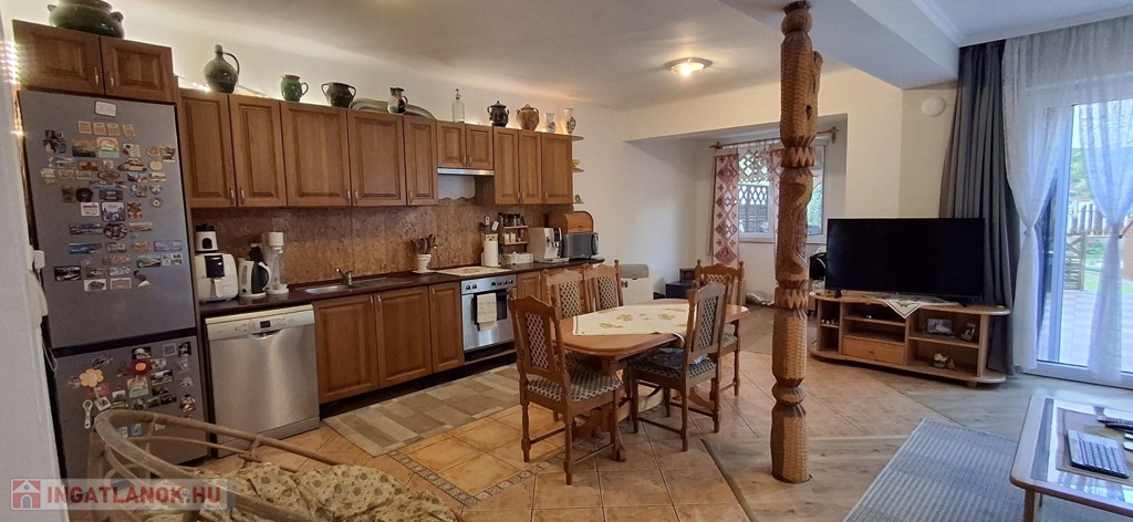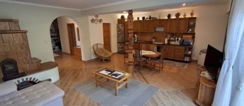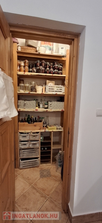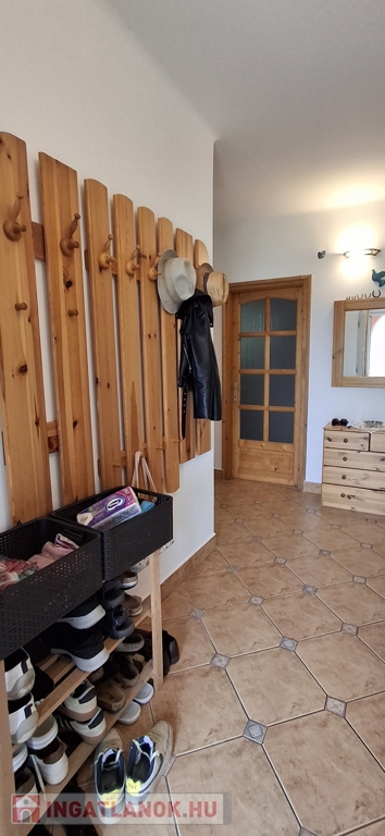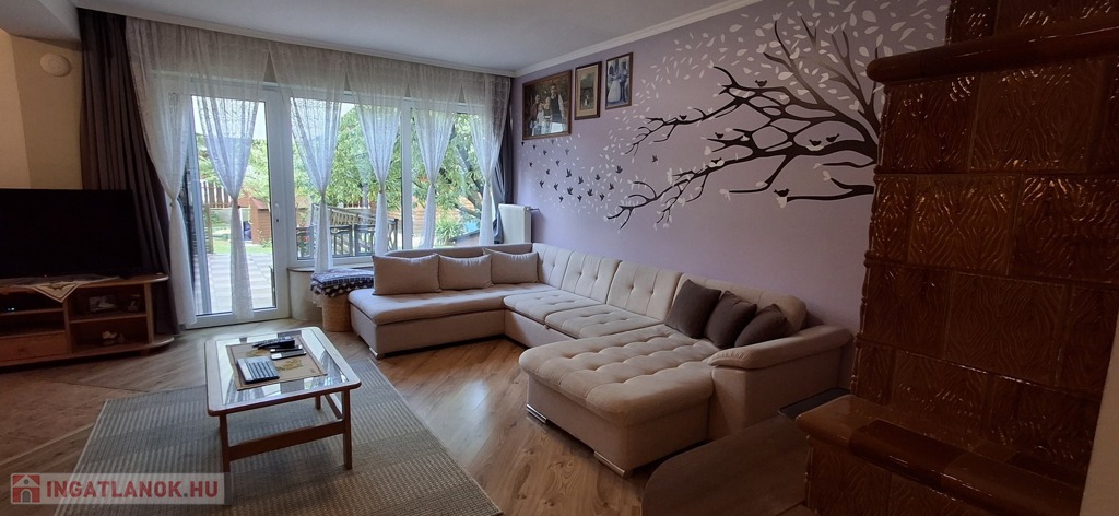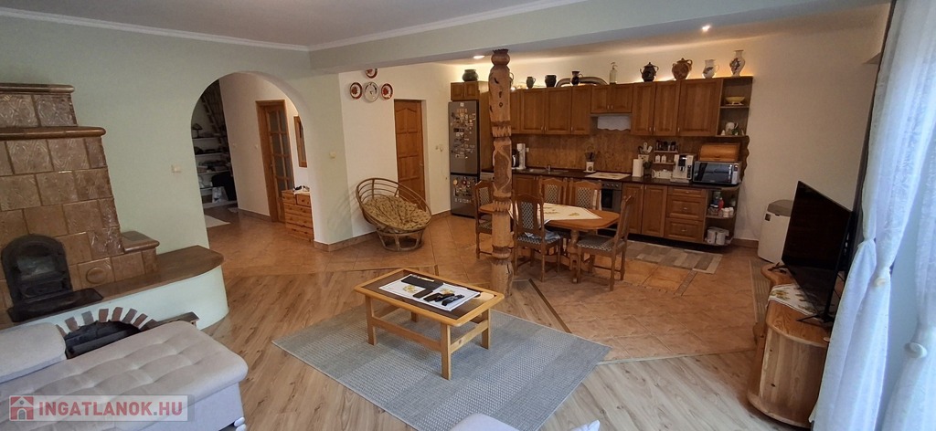Az alsó szinten: amerikai konyha + nappali, 3 hálószoba, spájz, konyha, fürdő, wc. A nappaliban egy szuper cserépkályha, mely igazán megadja a ház egész hangulatát.