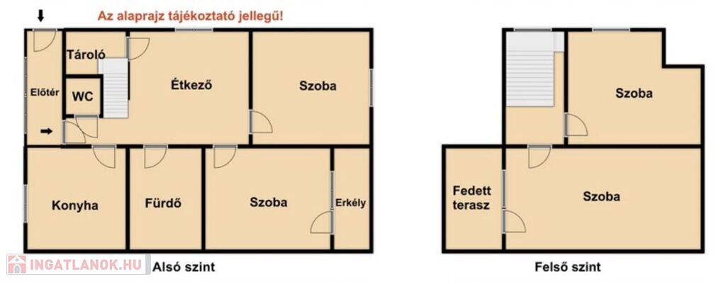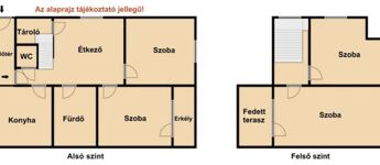 Földszint: nappali, 2 szoba, konyha, fürdőszoba, WC.