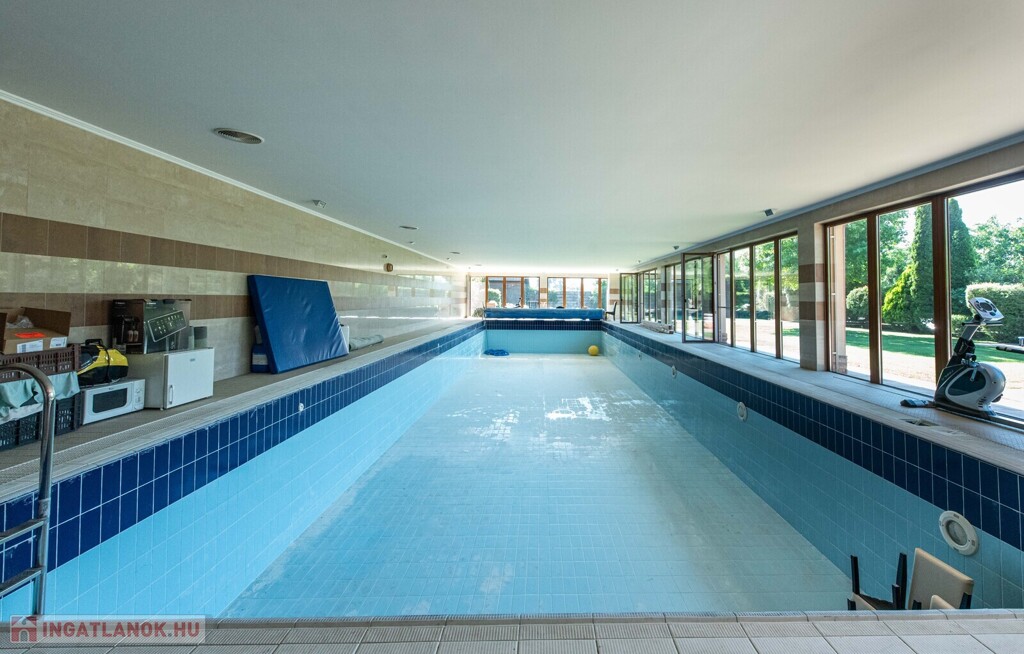 300 nm-es, zárt, 6×20 m-es medence, amely nyáron napkollektorral, télen gáz hőcserélős rendszerrel fűtött
