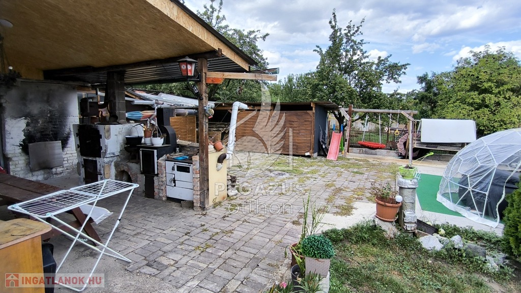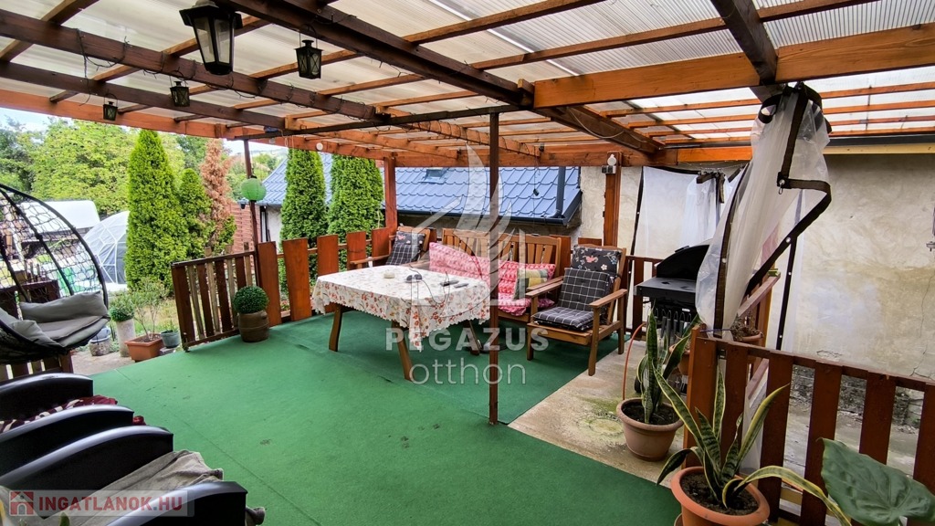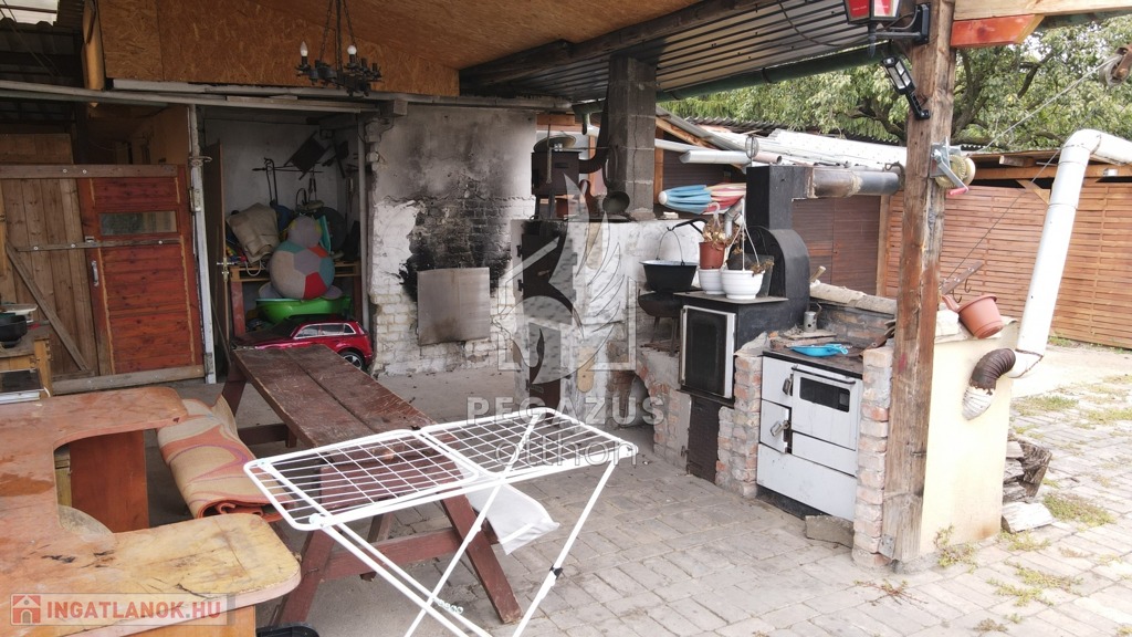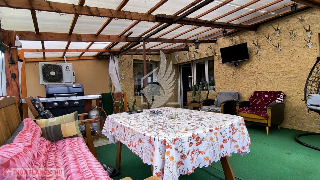 A házhoz egy hatalmas, fedett hátsó terasz is tartozik, ami ideális helyszín reggeli kávézáshoz, családi étkezésekhez és baráti összejövetelekhez, akár esős időben is. A kertben épített kemence és grillsütő igazi gasztronómiai élményeket ígér.