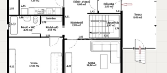 Itt két szoba, konyha, étkező, kamra, fürdőszoba, közlekedő és lépcsőház található.