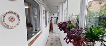 A lakásba a közös folyosóról nyíló saját tulajdonú folyosón/zárt gangon keresztül jutunk be. Ez a folyosó teljesen zárt, a kert felőli oldalon végig modern, műanyag ablakokkal ellátott, így mindig világos és hőszigetelt. Ezen folyosóról a kertbe is nyílik saját kijárat.