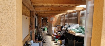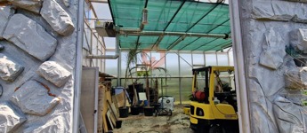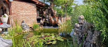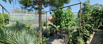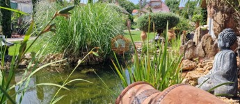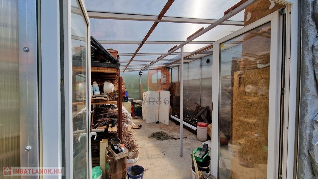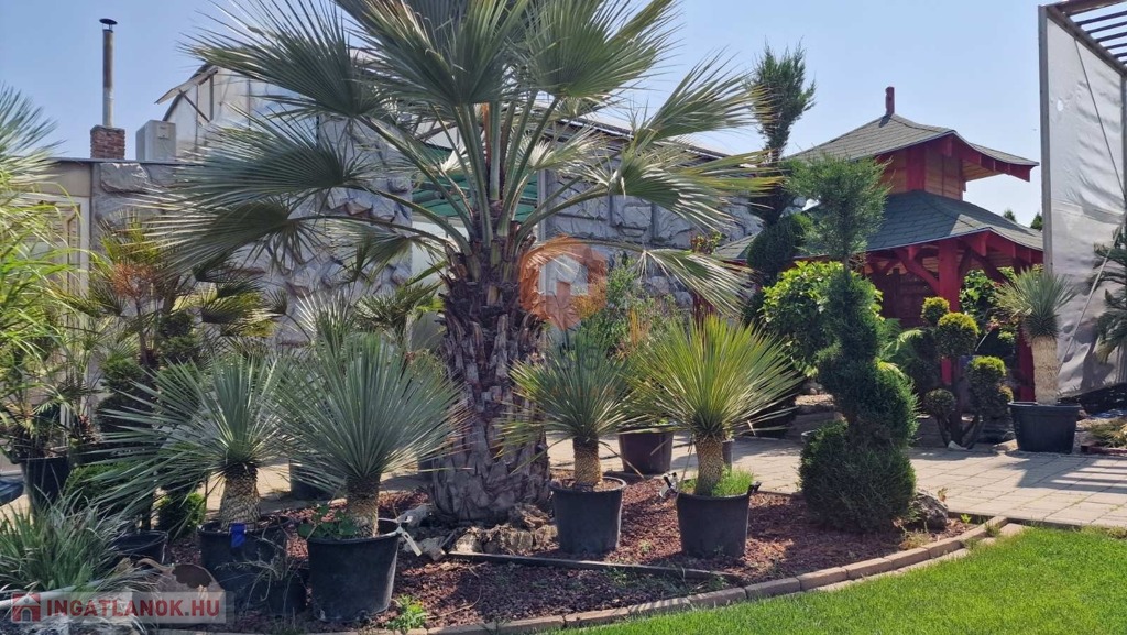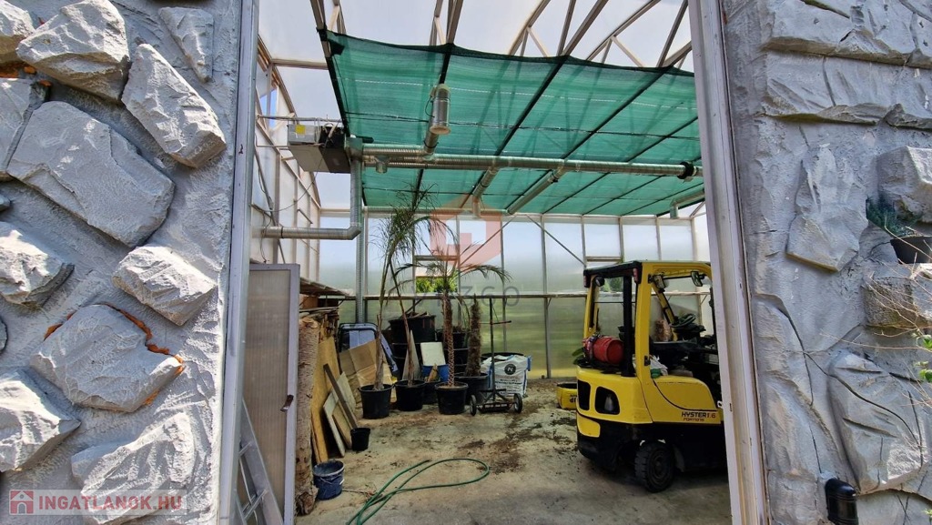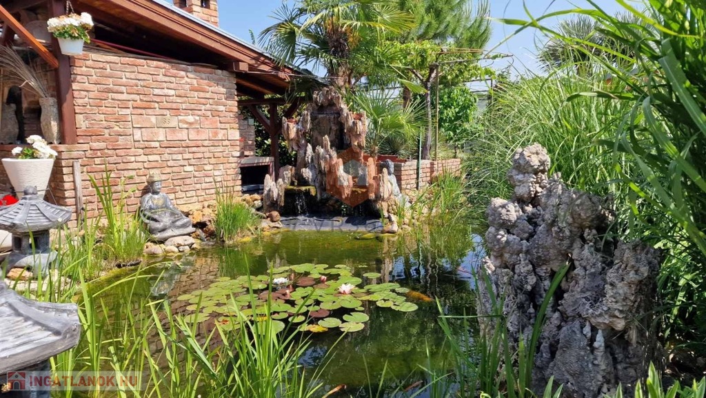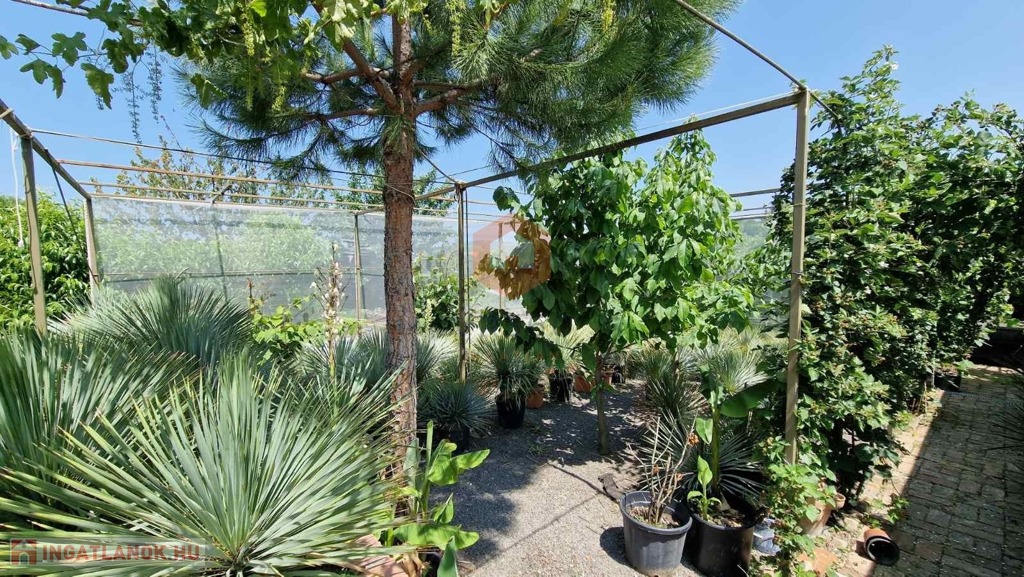 és benne egy 100 m²-es üvegház extra belmagassággal, kétfajta fűtéssel, japán pagodával.