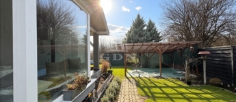 A telek 584m2, egy része térkövezett, hátsó része füvesített. A házhoz kapcsolódik egy fedett beálló és egy garázs is.