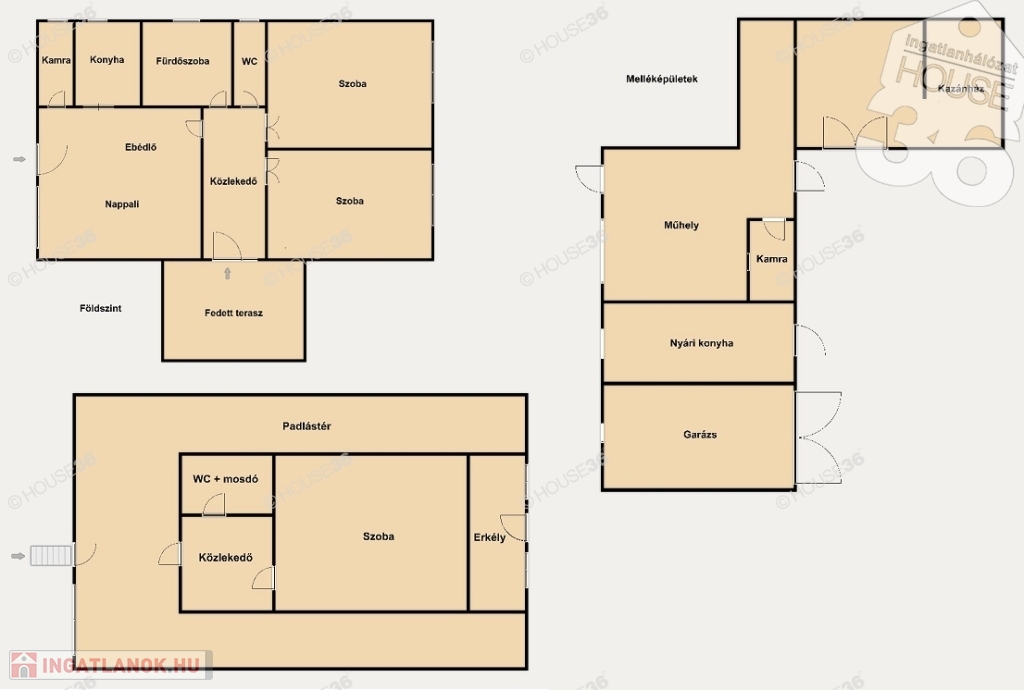 - kb. 60 m2, több helyiségből (garázs, nyári konyha, műhely, tűzifatároló) álló melléképület, állattartó egységek;