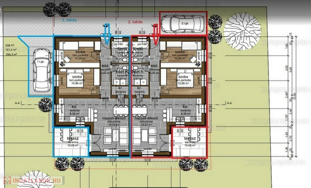 Az ingatlan felosztása a következő (64.09nm + terasz + saját kert kb. 200nm): előszoba (2.89nm), nappali-étkező (21.18nm), konyha (4.88nm), kamra (1.26nm), közlekedő (3.19nm), fürdőszoba (3.68nm), wc (1.35nm), 3 szoba (8.03nm, 8.8nm, 8.9nm), terasz (7.75nm).
