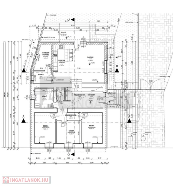 Elrendezését tekintve: három külön nyíló szoba , fürdőszoba , vendég mosdó , tágas előszoba és a napfényes amerikai konyhás nappali , közvetlen terasz és kertkapcsolattal és a gondos tervezésnek köszönhetően , külön helyiségben még , kamra és háztartási/ gépészeti helyiségnek is jutott hely.