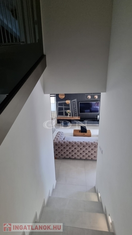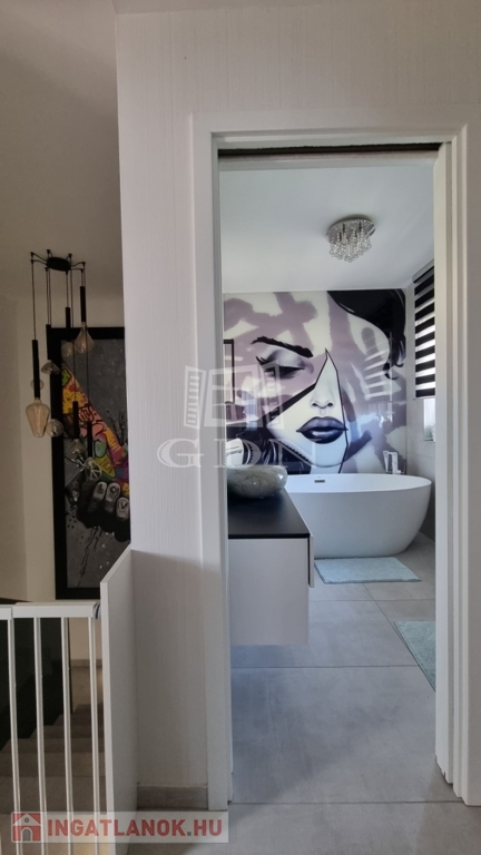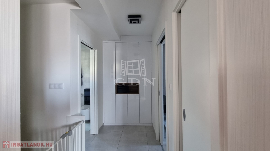 H-004303. Ráchegy, frekventált, kedvelt részén, összközműves építési telken, lakóparki környezetben, eladó egy 2022-ben épült kétszintes, igényes, egyedi kivitelezésű 150m2 hasznos alapterületű, nappali + 4 szobás+ jakuzzi, szaunaház/ konditeremmel ellátott önálló telekterülettel rendelkező családi ház, garázzsal, terasszal.