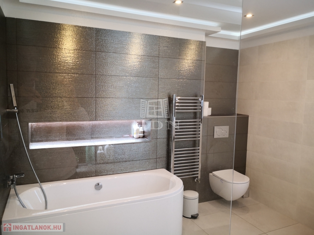 A modern, Siemens gépekkel felszerelt Nobilia konyha és a stílusos étkező mellett hat tágas szobával, elegáns gardróbbal, két exkluzív fürdőszobával, valamint négy WC-vel és tágas, világos terekkel rendelkezik. A középső szinten magas minőségű, gyönyörű parketta a burkolat, a prémium életérzés a ház minden apró részletében jelen van, amit az alábbi felszereltség is erősít.