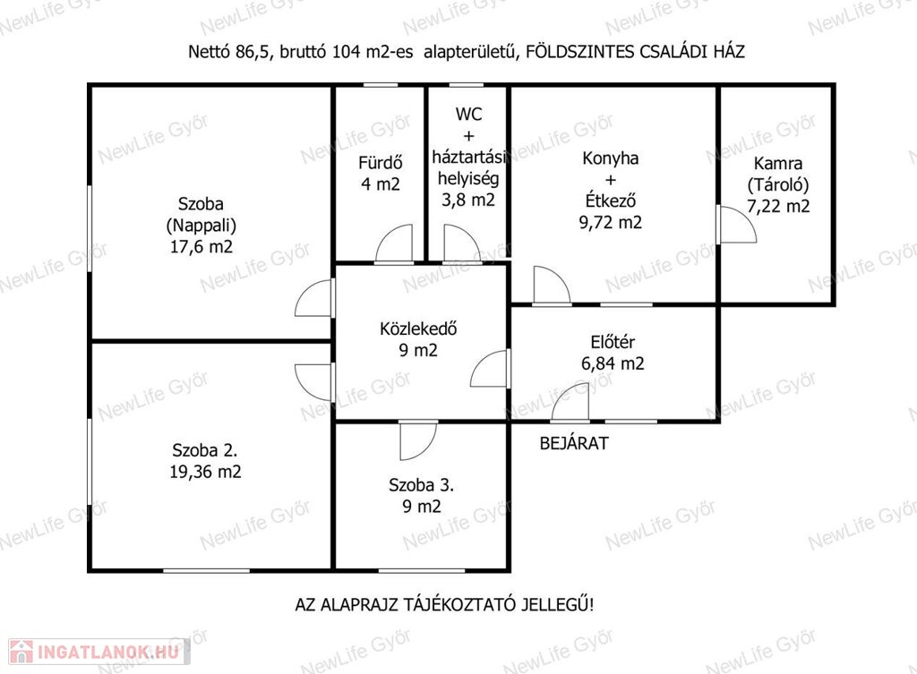 A nettó 86,5 m² (bruttó 100 m²) alapterületű ingatlan nappali + 2 külön nyíló szobával rendelkezik, 2834 m²-es, gondozott telken helyezkedik el.