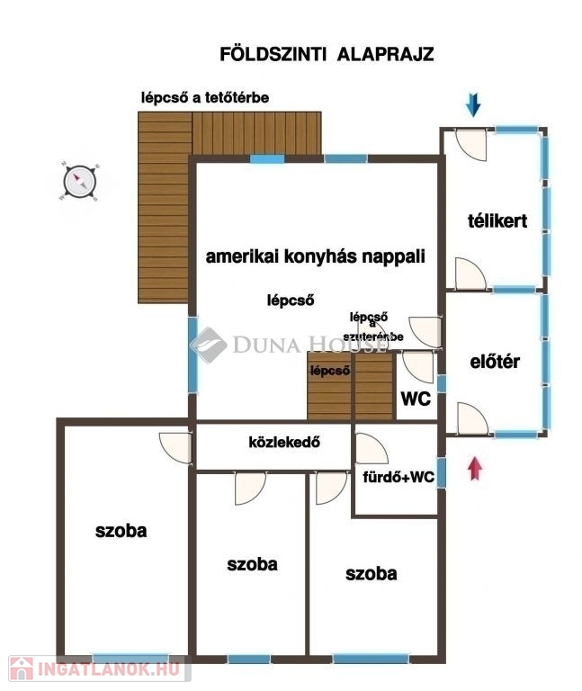 - földszinten amerikai konyhás nappali + 3 szoba , fürdő WC- vel, külön WC, valamint fűtött előtér és télikert,