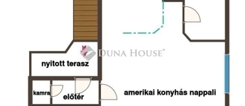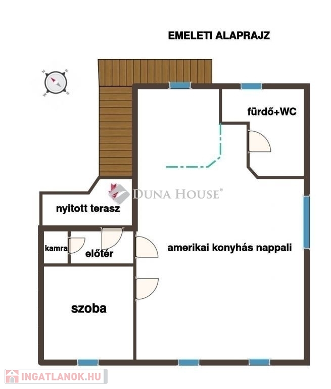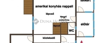 - az emeleten amerikai konyhás nappali + 1 szoba, fürdő WC vel, előtér és kamra elosztású.